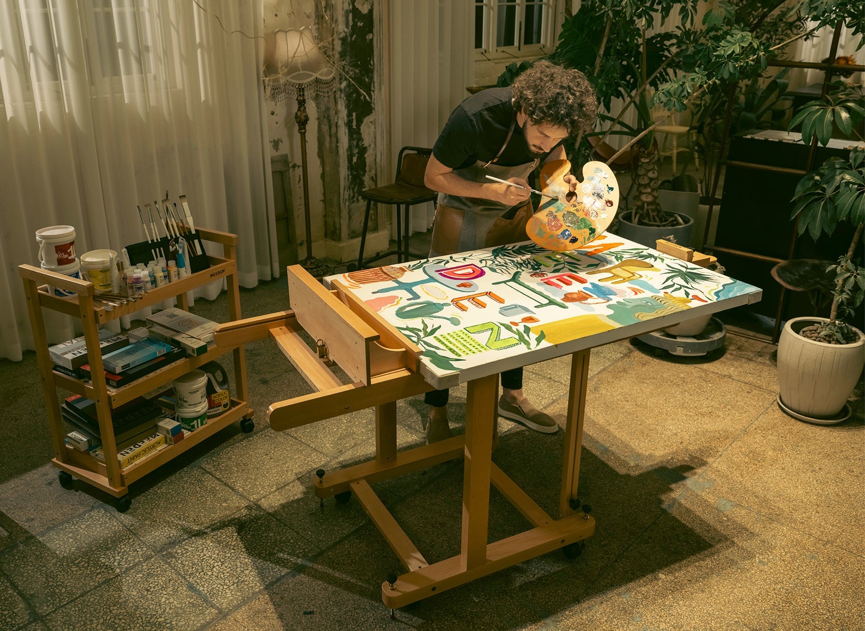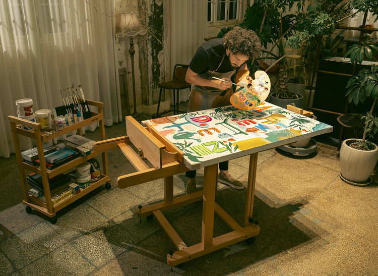 Easily adjust the tray height from 10"-50" for comfortable painting while sitting or standing.