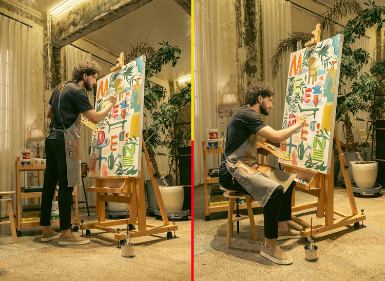 Made of solid German beech wood, this elegant and sturdy MEEDEN studio easel holds artwork up to 70 lbs. Versatile for various mediums, it adjusts horizontally for watercolor and paint pouring, or tilts for pastel, acrylic, oil, and gouache.